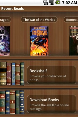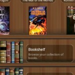 Available on the Android Market for free and currently a featured app on Sprint, Aldiko allows you search through thousands of public domain titles from Feedbooks, O’Reilly Ebooks, and Smashwords. The catalog is broken down into several categories, with book selections being listed with title and cover art. Selections are downloaded to your personal bookshelf and stored on the SD card. Most recently read books show up on the home screen bookshelf.