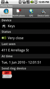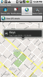 Now you are probably thinking, ‘That’s pretty useful.’ But wait there is more! You can also set it up to alert your friends on FaceBook , Twitter, Email or SMS that you have lost your valuables. I say valuables because it doesn’t have to be the keys, it could be your phone. One of my favorite features is the alert system. Included in the message that is sent, is a map to exactly where your item is! Of course the accuracy is dependent upon your devices GPS but is usually good to within +-10 Meters. Accurate enough to get you nearly next what is missing. Â You couple all this with the ability to change the alert tone on your Android powered device, a lock screen with a lock timer and custom password and you have a very thought out well rounded useful application and device.