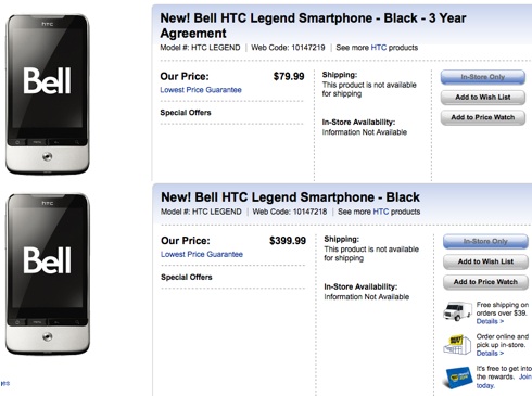 We heard a lot of rumors saying that Bell will launch the HTC Legend this summer, but we haven’t gotten any solid proof until now. If you go over to the Best Buy Canada Mobile site, you will see the HTC Legend in Bell section, and it comes with the price tag of $79.99 with a 3-year contract or $399.99 without contract. It looks like the device is going to be only available in stores with no pre-order option. So I think Bell has found this way to tease their customers. What are you waiting for? You can call or head over to your local Best Buy or Bell franchise, maybe they can give you more information. I believe that Bell will introduce this device by June 16th.