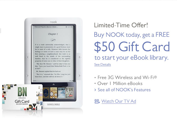 Purchase a NOOKâ„¢ at participating Barnes & Noble retail stores or online at www.bn.com , and receive a $50.00 Barnes & Noble Gift Card, while supplies last. This promotion is valid from June 2, 2010 through July 3, 2010. This offer is only valid for purchases made at Barnes & Noble retail book stores where NOOK is sold and for orders placed on www.bn.com.