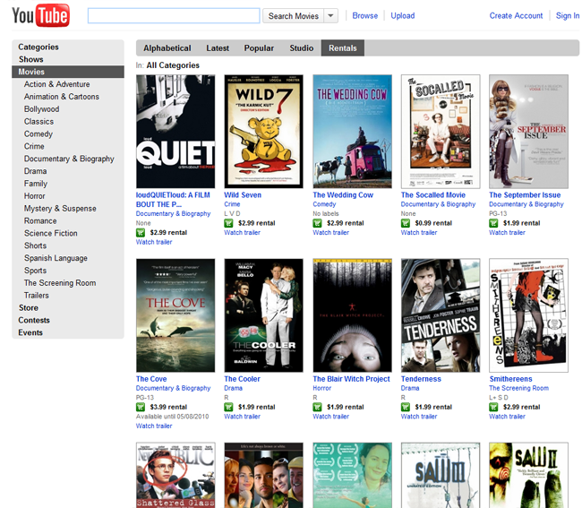 In fact, with a quick search on YouTube a mere 3 pages of videos showed up in the For Rent category. Some good movies, but not enough to entice me to the service. Some memorable names include: The series of SAW movies, Reservoir Dogs, Precious, Lord of War, Gamer, and Dogville.