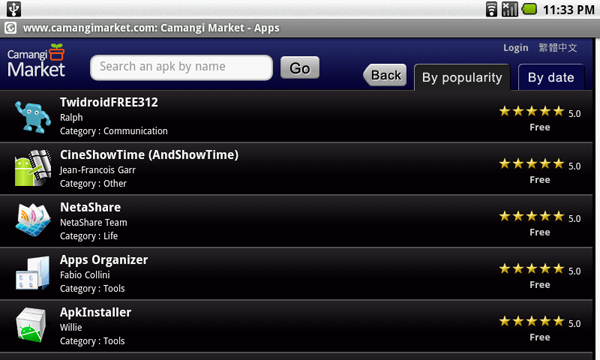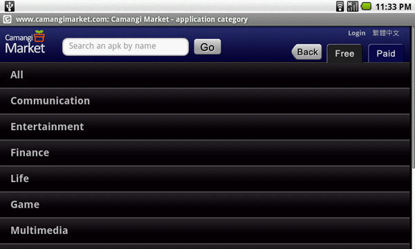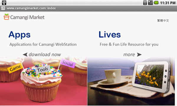 The device is not Google branded and does not include any of the usual Google applications which was also very frustrating to me. There was an Icon for GMail, but when clicked it simply took you to the Gmail web page. You don’t even have access to the Android Market. Camangi have created their own Camangi Market, but it’s currently no substitute for the Android Market. Application selection was sparse. The Camangi Market is web based from what I can tell.