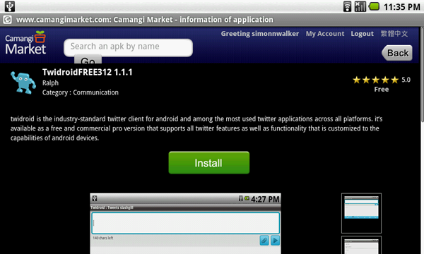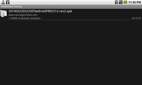 Installing applications from the Camangi Market came with another surprise; the applications do not automatically install, instead the APK file is downloaded and you then have to click on the APK file to install it.