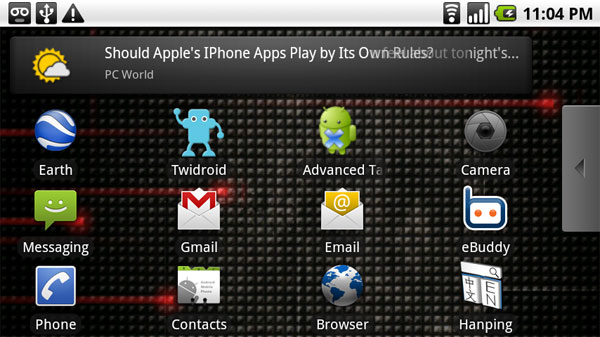 Reporting that Pinch and Zoom is now fully working with some caveats about the level of zoom. There is the usual assortment of Android 2.1 gizmos, including; The news and weather widget, live wallpapers, the updated gallery application and it now has the ability to run the latest version of Google Earth.