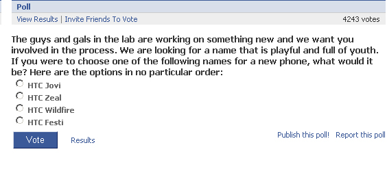HTC has taken to their Facebook page and is currently running a poll to name their next device. Â As you can see, they’re trying to project an image of youth and playfulness. Want to make sure your next phone isn’t the HTC Festi? Head over to HTC’s Facebook page to cast your vote. As of this post, Wildfire is in the lead with roughly 1,000 votes over Zeal.