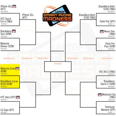 Ah March, that time of year where it seems like almost everyone has gone basketball crazy. Over at Laptop Magazine they’re doing a smartphone-themed bracket. It’s still in the early rounds, but with 6 Androids up for competition, there is a good chance one will be winner. The only question is, which one? Head over to Laptop Magazine to cast your vote; today it’s Motorola Droid vs. BlackBerry Curve 8530 with the Droid ahead 718 to the Curve’s 207 as of this posting.