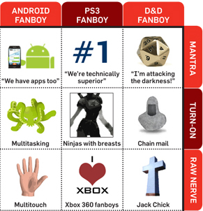 Over at PC World, they’re concocted a chart to help identify which way that fanboy, or girl rolls. Presented to you without comment, The Field Guild to Fanboys.